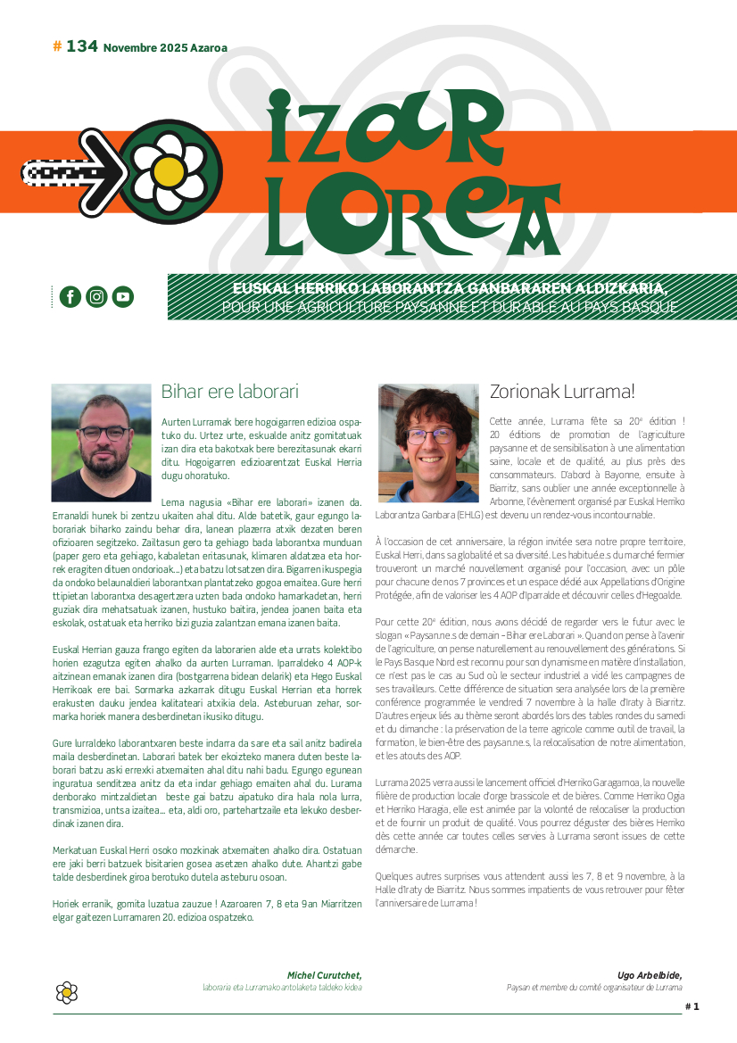 Euskal Herriko Laborantza Ganbara is a non-profit farming and rural development association (1901 Act under French law), founded on 15 January 2005. Its aim is to encourage peasant agriculture, as well as preserve our rural heritage, as part of local development focused on the Basque Country.